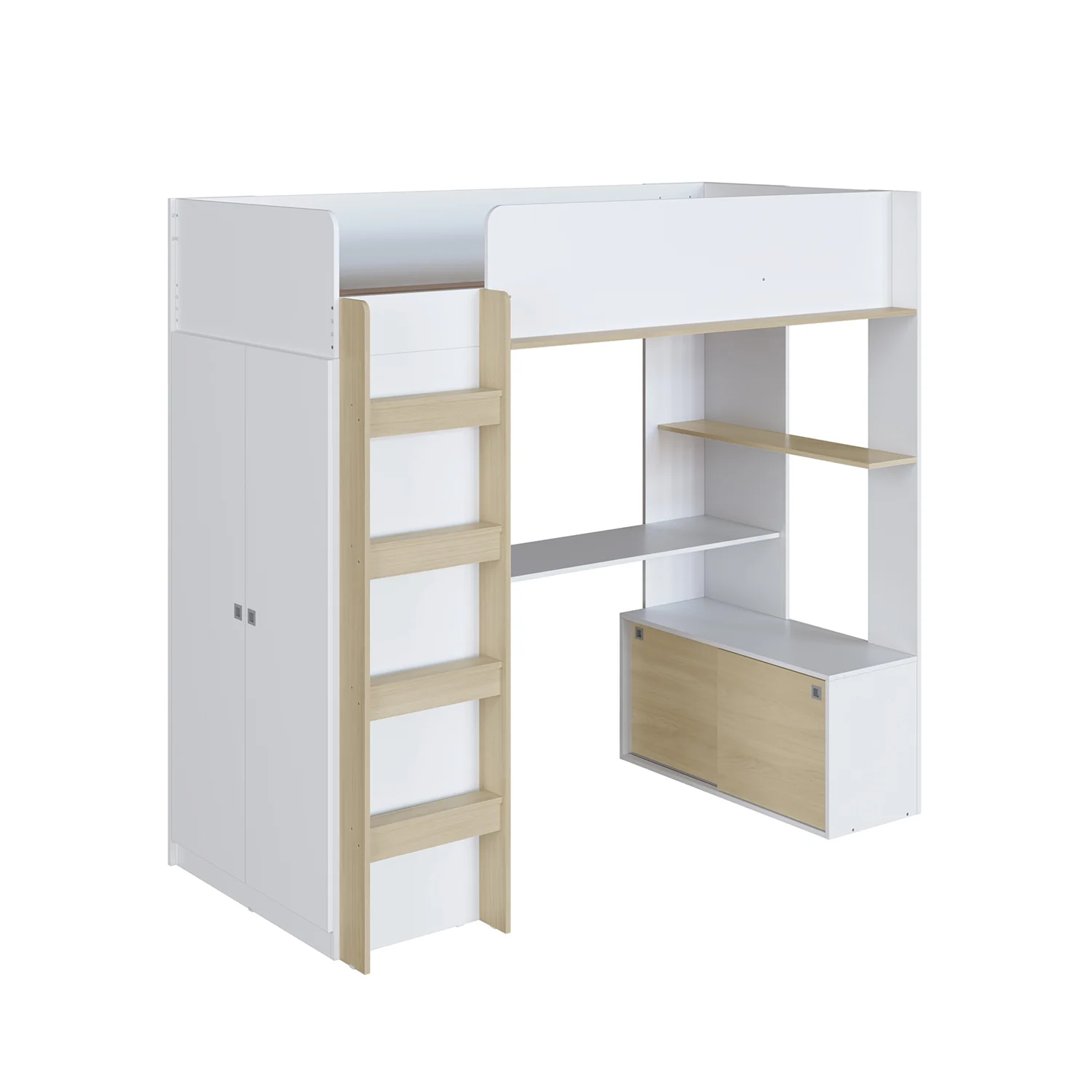 Con un diseño elevado tipo loft, la cama multifuncional Axel combina zona de descanso, almacenamiento, y área de estudio en una sola estructura funcional, moderna y compacta. Su estructura integra una cama superior de una plaza con escalera lateral, un escritorio integrado, estanterías abiertas para libros o decoración, y un clóset con puertas para guardar ropa u objetos personales. Además, su módulo inferior cuenta con un práctico gabinete con puertas corredizas que amplía aún más el espacio de almacenamiento.