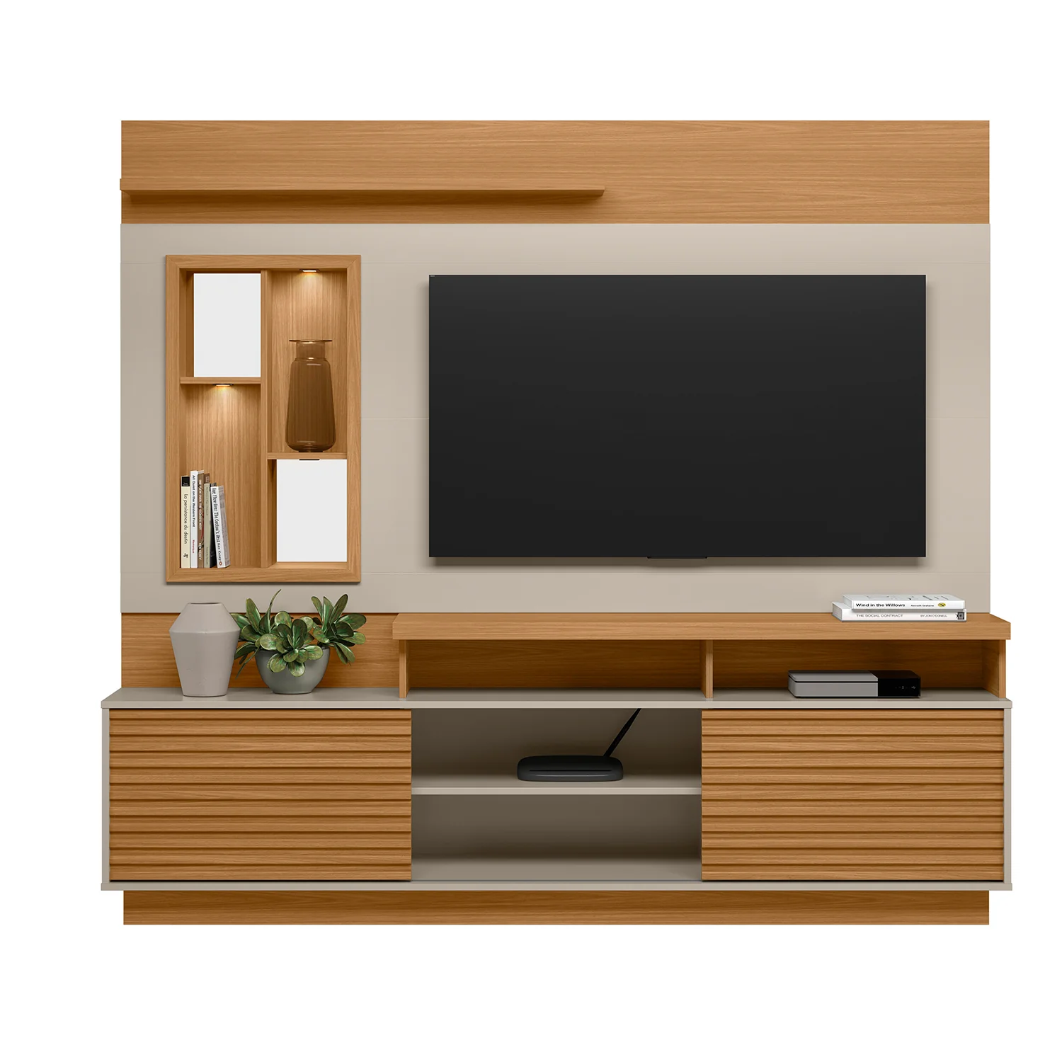 Mueble entretenimiento elaborado en Madera Industrializada de Pino (MDF/MDP) con acabado semimate en pintura UV color Natural-Off White, capacidad para TV hasta 60".Este mueble de TV incluye: luz tipo LED, espejo decorativo, 4 repisas de madera, entrepaño removible, 2 Espejos, 2 puertas corredizas para almacenamiento extra y Soporte para TV.