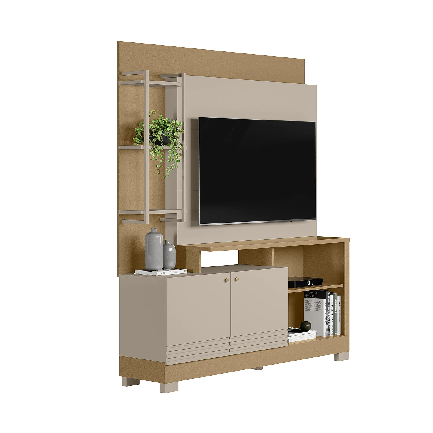 Trasforma tu sala con este elegante centro de entretenimiento. Diseñado para televisores de hasta 50", su estructura combina madera y MDF, ofreciendo durabilidad y estilo. Cuenta con manijas de cuero sintético que aportan un detalle exclusivo, además de un amplio espacio de almacenamiento con compartimentos abiertos y cerrados para organizar tus dispositivos, libros y elementos decorativos. Su diseño moderno y versátil lo convierte en la opción ideal para realzar cualquier sala de estar.
