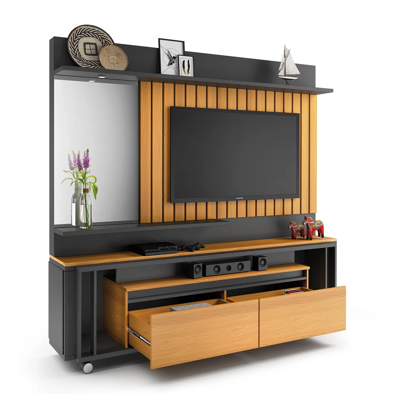 Centro de Entretenimiento elaborado en madera industrializada de pino (MDF/MDP), con una pintura UV que garantiza su durabilidad y resistencia. Su diseño añade un toque contemporáneo y atractivo, convirtiéndolo en un punto central destacado en tu sala de estar. Cuenta con dos gavetas con rieles extensibles para un almacenamiento conveniente, y un elegante espejo lateral que agrega un toque de estilo. Además, está equipado con luces LED para crear un ambiente acogedor, rodachines para facilitar su movimiento y espacio para televisores de hasta 60 pulgadas. Incluye un soporte de TV para una instalación rápida y sencilla. Transforma tu espacio de entretenimiento con este centro versátil y funcional. Transporte y armado gratis.