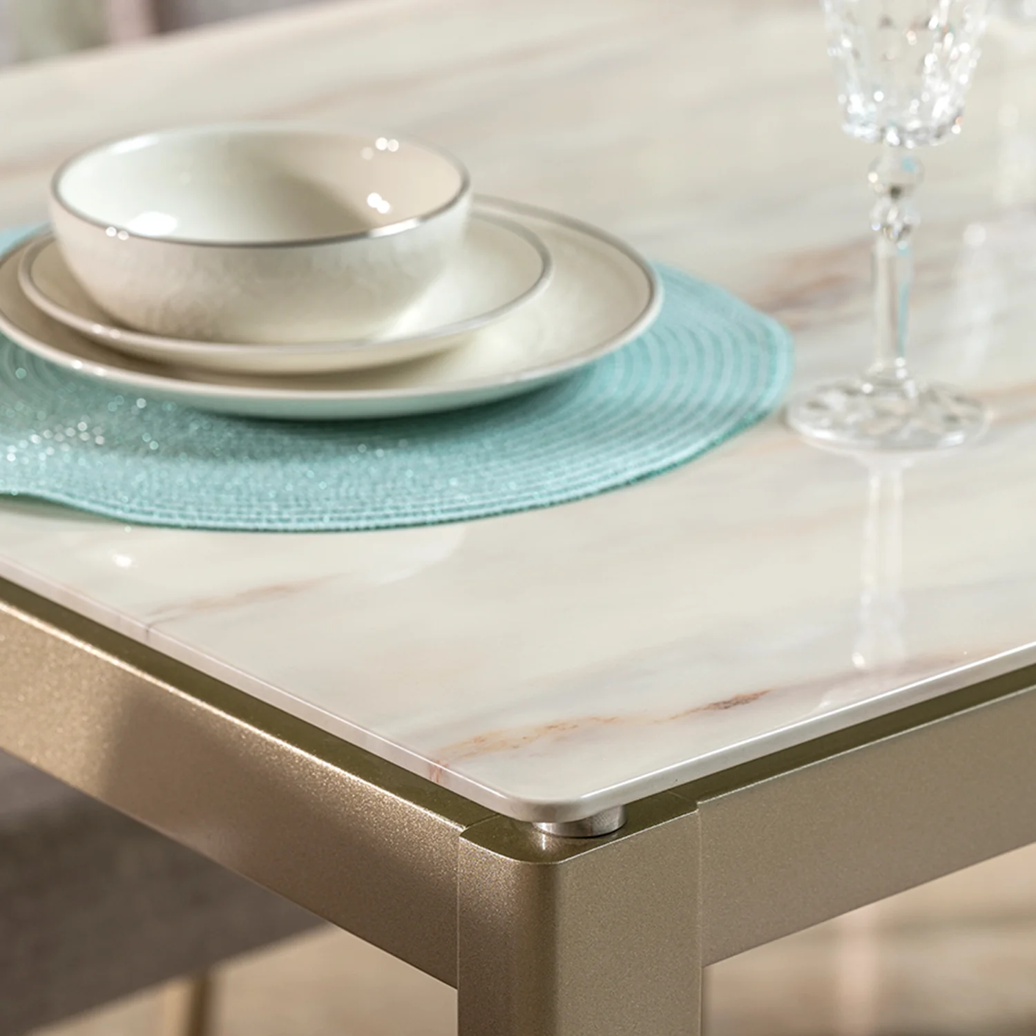Mesa Comedor 8 Puestos Roma Blanco Perla, Champaña Marmolizado