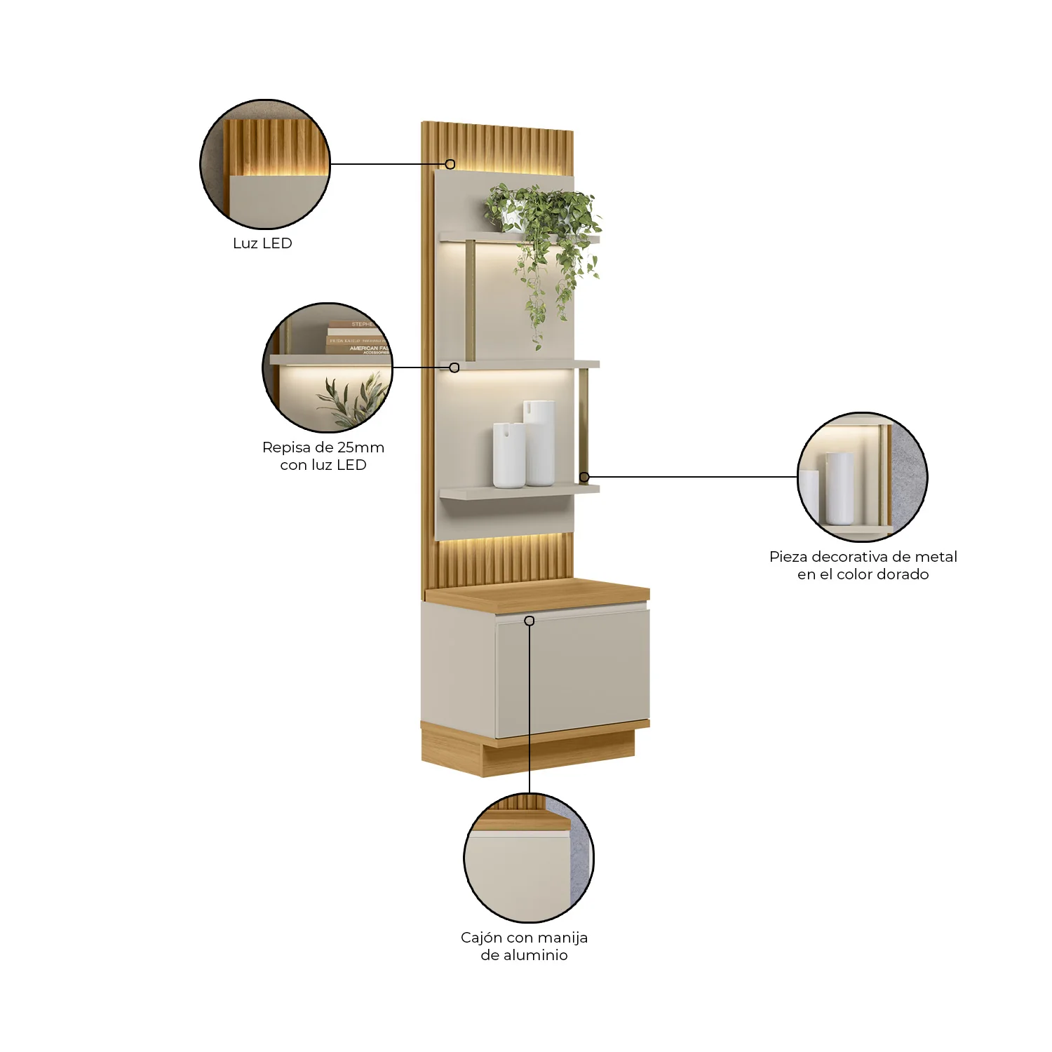 Añade un toque de elegancia y modernidad a tu hogar con con este mueble decorativo, diseñado para realzar cualquier espacio. Sus repisas cuentan con iluminación LED integrada, creando un ambiente cálido y sofisticado, perfecto para destacar tus objetos favoritos. Además, incorpora una pieza decorativa dorada metálica, que aporta un acabado refinado y contemporáneo. Con almacenamiento cerrado y estantes abiertos, este mueble es ideal para organizar y embellecer cualquier rincón de tu hogar.