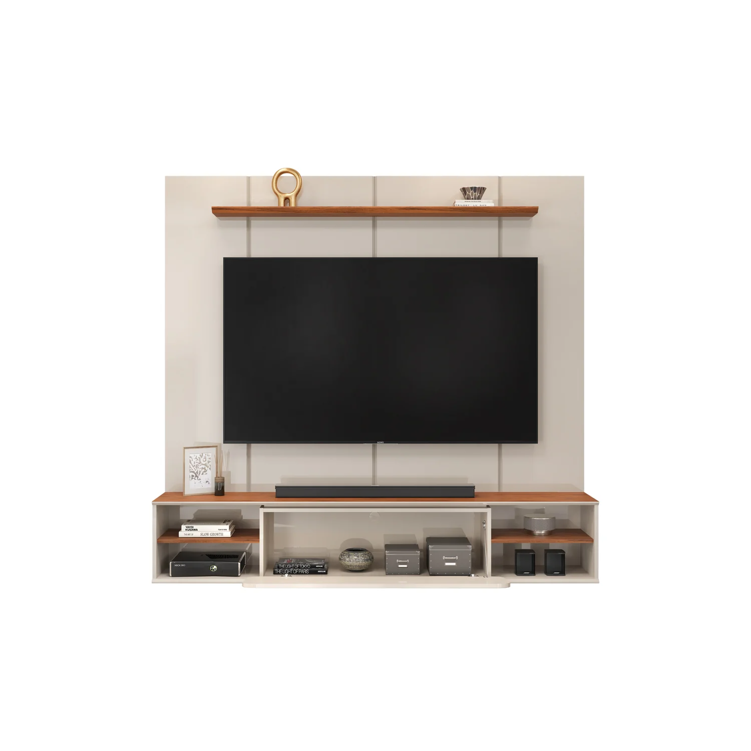 El Panel de Tv Alany Off White, Natural está elaborado en madera industrializada de pino con una resistente pintura UV que asegura durabilidad y protección. Cuenta con una puerta abatible de diseño elegante con esquinas redondeadas y cuatro nichos laterales para almacenamiento. Este panel es ideal para televisores de hasta 70'', proporcionando un diseño moderno y funcional para cualquier salón o área de entretenimiento.